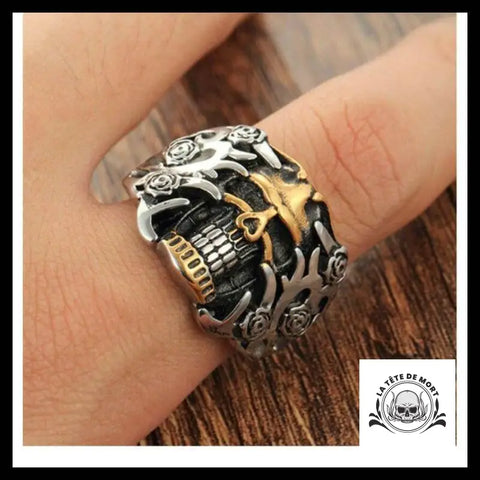 Il semblerait que le Prince Charmant n'ait en réalité jamais réussi à traverser les rosiers qui le séparaient de sa belle ! Son crâne est ici représenté sur cette belle bague ! Enragé par la douleur des épines plantées sur tout son corps, son visage est totalement crispé ! Sur le côté de la bague on aperçoit ses fameux rosiers qui n'épargnent hélas personne ! Magnifique cette bague !