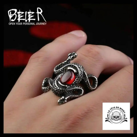 Un petit joyau rouge au centre d'une bague magnifique ! Tout ces serpents devraient vous effrayer puisqu'il s'agit du serpent corail qui est le plus venimeux du Monde ! Mais qu'importe avec cette bague vous ne craignez rien et ça sera très certainement la seule fois que vous les verrez d'aussi près !
