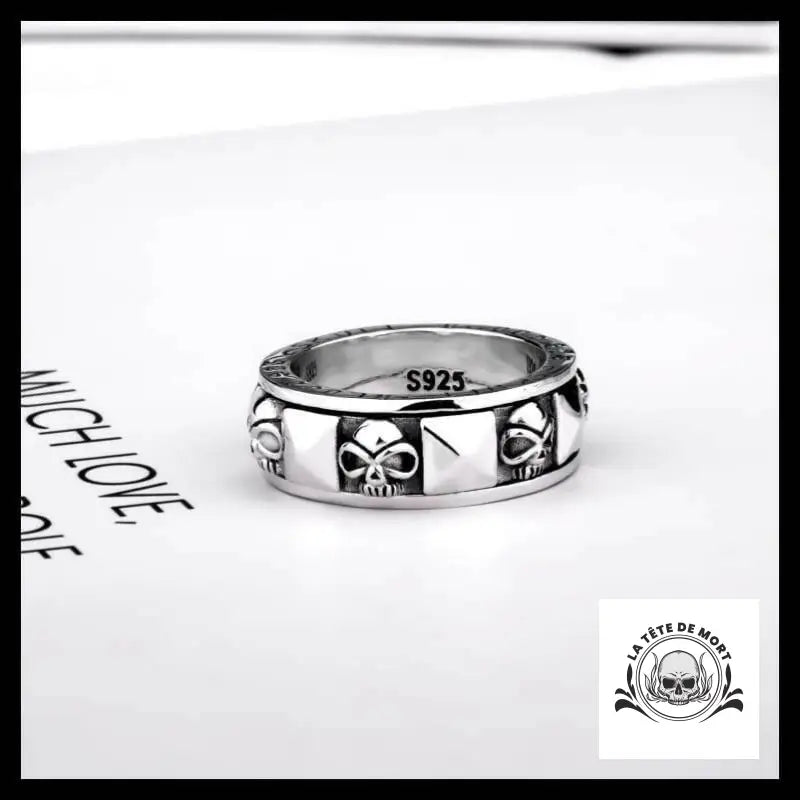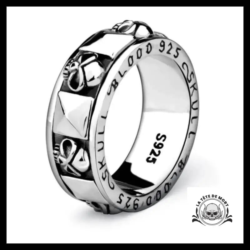 Laisse-toi plonger dans les abysses obscures avec cette Bague Tête de Mort en Argent 925. Elle est ornée de magnifiques gravures représentant un crâne et du sang.