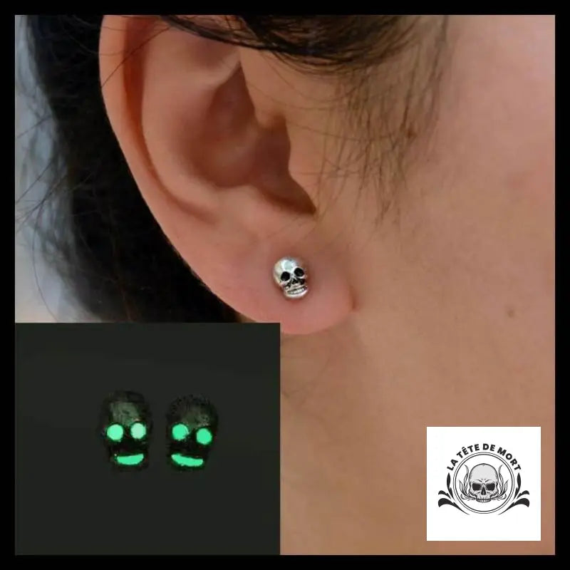 Petites boucles d'oreilles tête de mort qui après s'être rechargées auprès d'une source lumineuse vous montreront un nouveau visage ^^, plus visible dans l'obscurité les yeux et la bouche de chacune d'elles vont comme s'allumer, une petite fantaisie fluorescente originale !