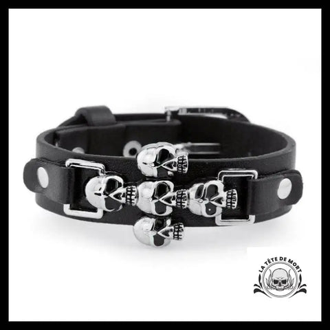 Ce bracelet en cuir est superbe ! Une croix se dessine grâce à une association de 5 tête de mort. Un bracelet unique qui sera jalousé de tout vos amis.