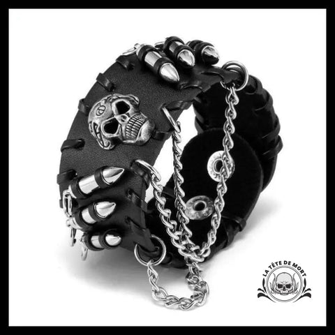 Wah ! Mais quel bracelet ! Avez-vous déjà vu un tel chef d'oeuvre ? Une jolie tête de mort au centre pour donner du caractère, des petites chaînettes sur un bracelet en cuir. Les détails vous impressionneront alors sautez le pas !