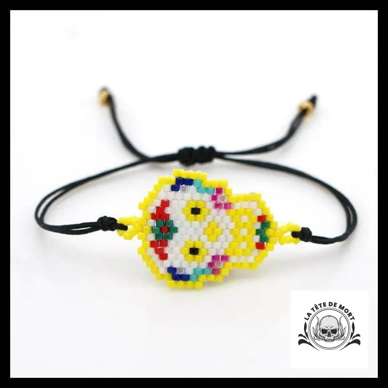 Magnifique portrait d'une jolie tête de mort, vous ne trouvez pas ? Un peu de jaune pour vous apporter le pep's qu'il vous faudra pour assumer votre longue journée ! Le bracelet idéal pour vous !