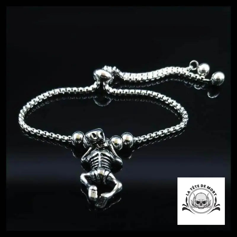Ce petit squelette à l'air bien inquiet par le vide qui règne sous ses pieds, vous ne trouvez pas ? Il s'accroche fermement au bracelet et ne lâchera pas tant qu'il aura les deux pieds sur terre.