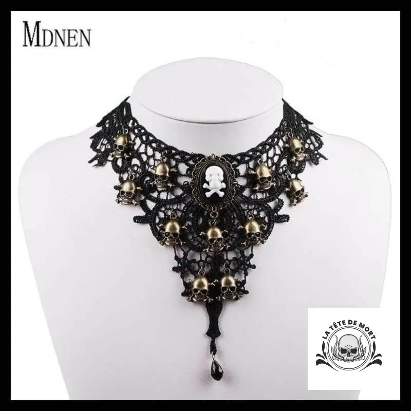 Collier Tête de Mort Dentelle Noire et Rose