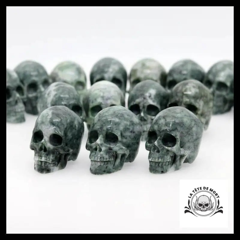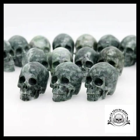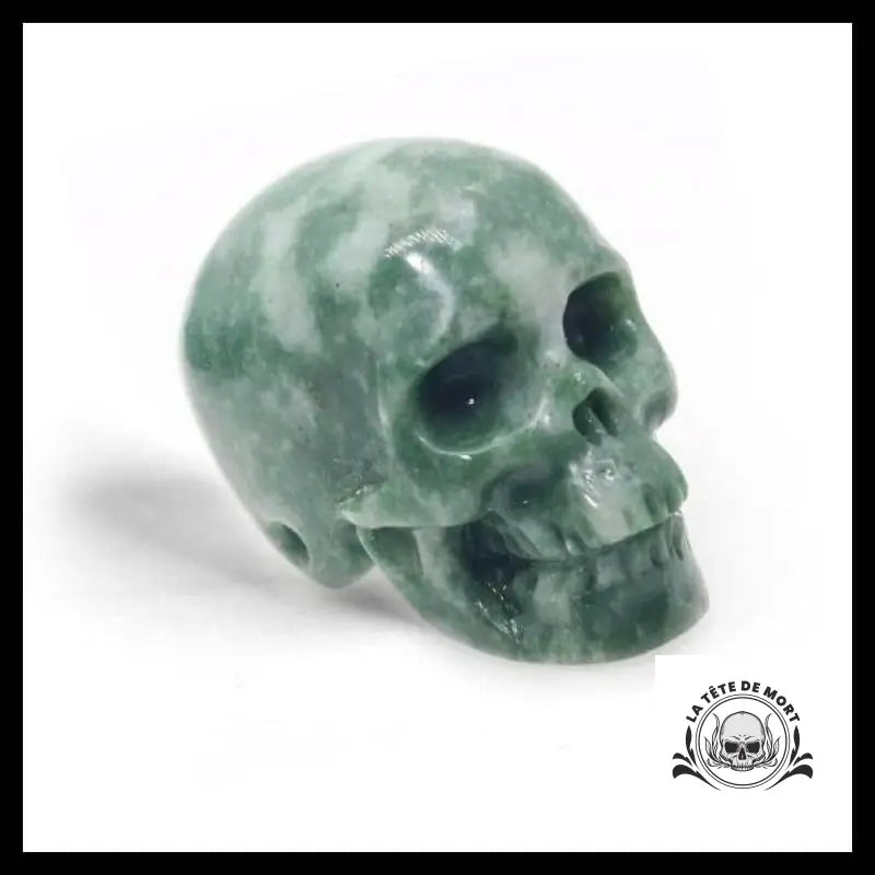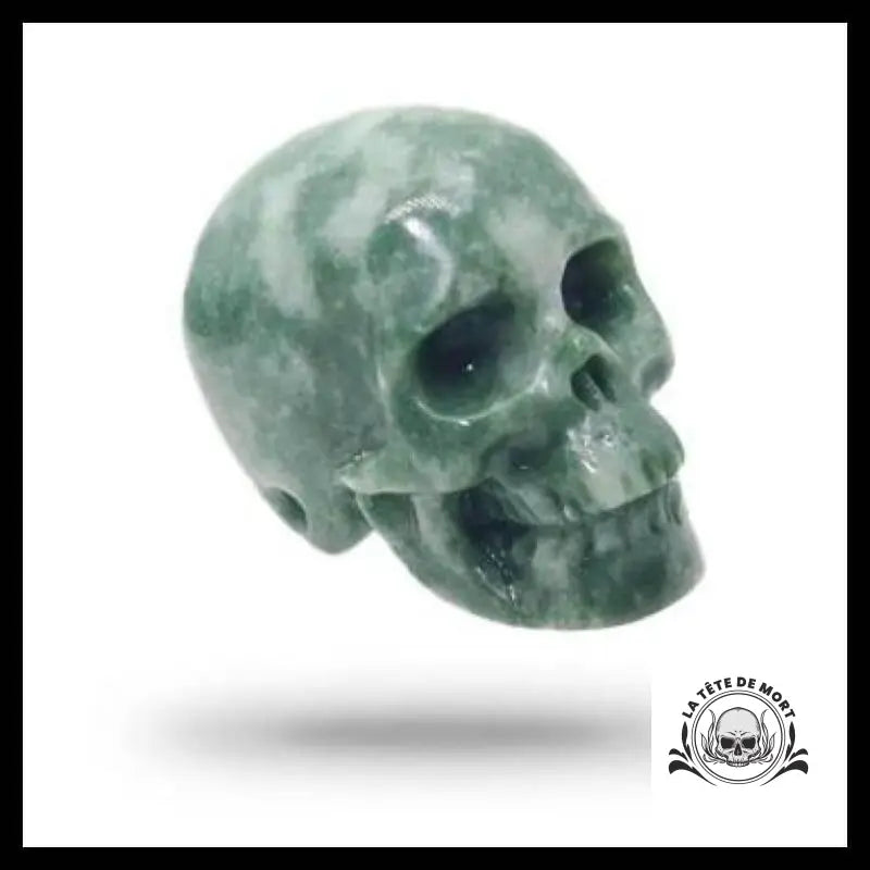 Ce crâne en jaspe vert est un élément décoratif élégant qui ajoutera une touche d'harmonie à votre maison. Il sera idéal sur un bureau et contribuera à l'équilibre de l'environnement.