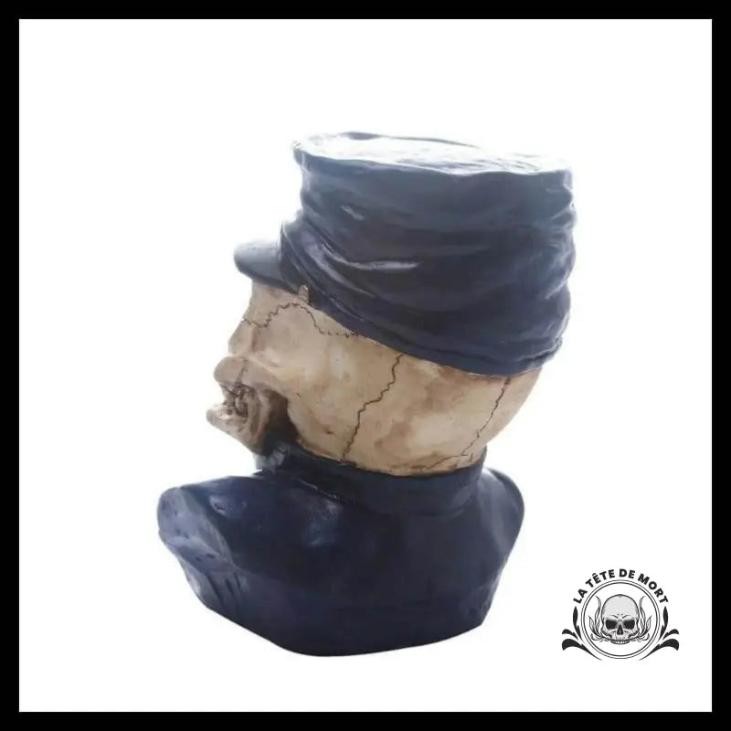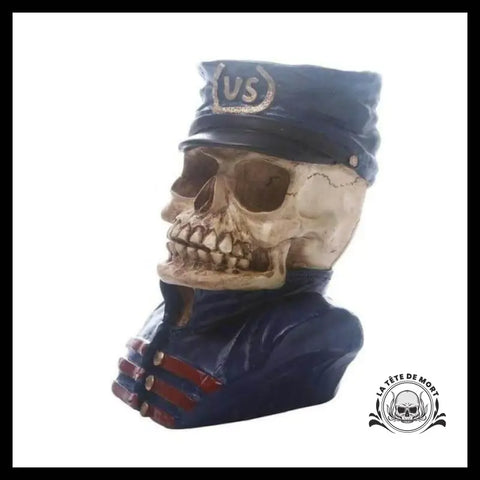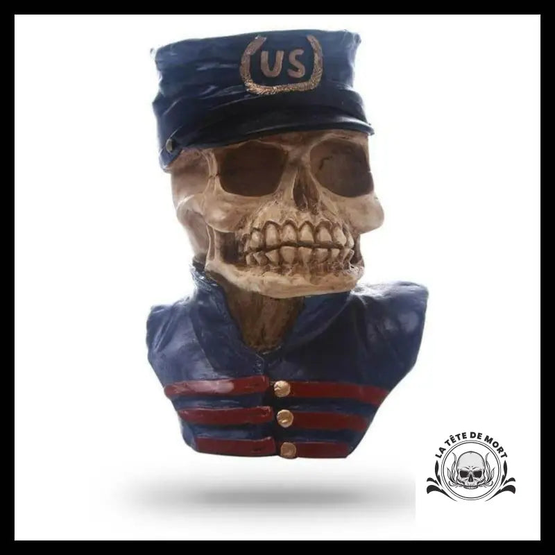 Ce crâne de tête de mort en tant que décoration présente le buste d'un policier américain en uniforme, provenant d'une époque révolue.
