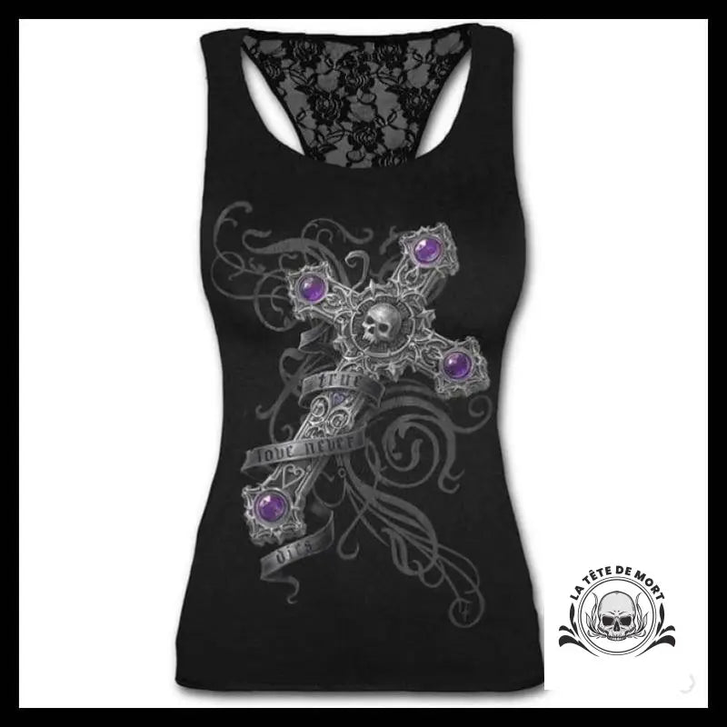 Ce débardeur échancré avec un imprimé tête de mort et une croix est idéal pour ceux qui cherchent à allier confort et style unique. Conçu pour les déesses gothiques, il vous permettra de vous démarquer.