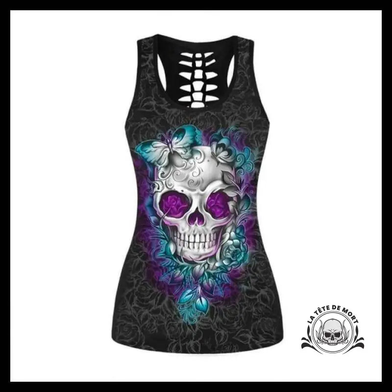 Ce débardeur pour femme présente un design raffiné et féminin, mettant en valeur un crâne orné de deux papillons sur un fond sombre décoré de fines feuilles.