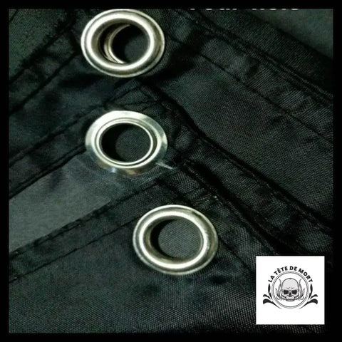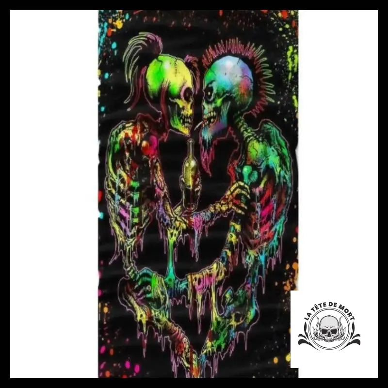 Nous avons à disposition un superbe drapeau punk représentant deux squelettes amoureux. Leur passion débordante fait exploser les couleurs vives qui les entourent, comme une danse macabre.