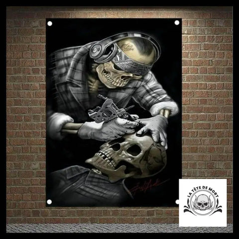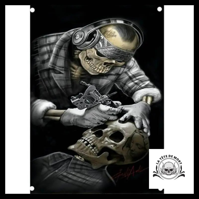 Découvrez un drapeau arborant un motif de tatouage squelette qui met en avant le talent inégalé d'un tatoueur légendaire de l'au-delà. Ses compétences expertes en manipulation de l'aiguille lui permettent de créer des designs infernaux, faisant de chaque création une décoration diaboliquement unique.