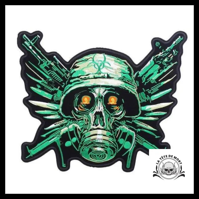 Il y a une tête de mort qui se cache sous le masque à gaz et le casque de soldat. Si tu veux éloigner tes ennemis, cet écusson orné d'armes est parfait pour cela.