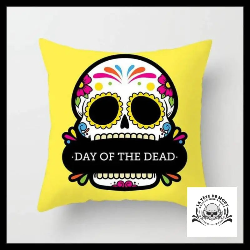 Day Of The Dead signifie " le jour des morts " . Cette taie d'oreiller peut faire référence à plusieurs choses, la musique, le cinéma, des séries... À vous de faire votre choix !