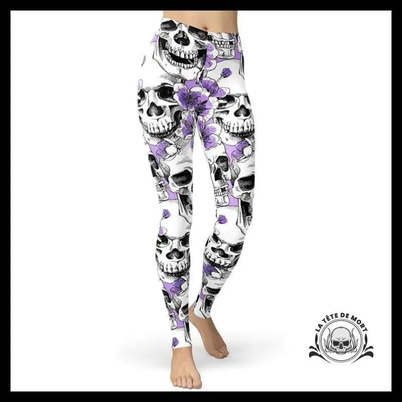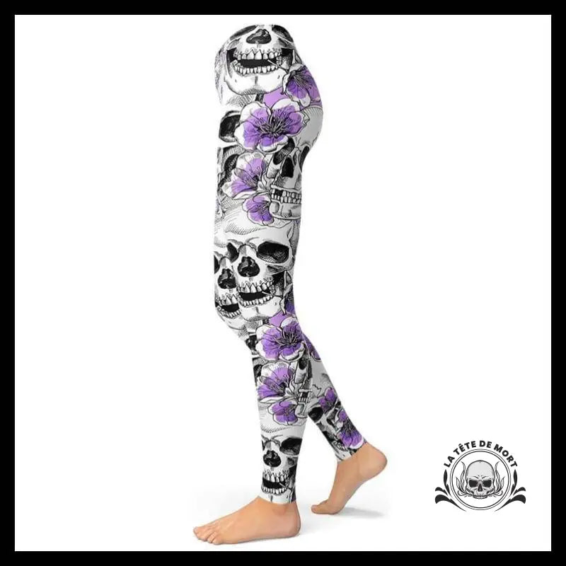 Le legging tête de mort mexicaine avec fleurs apporte une touche unique à ta garde-robe avec son mélange de crânes et de fleurs violettes. La couleur monochrome et les touches de violet donnent un look décalé et original.