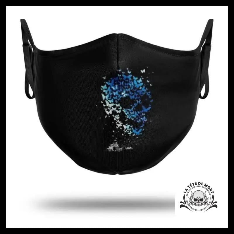 Le masque de protection en tissu noir arbore un design élégant de crâne composé de papillons. Ce modèle est notre plus léger en termes de masques tête de mort.