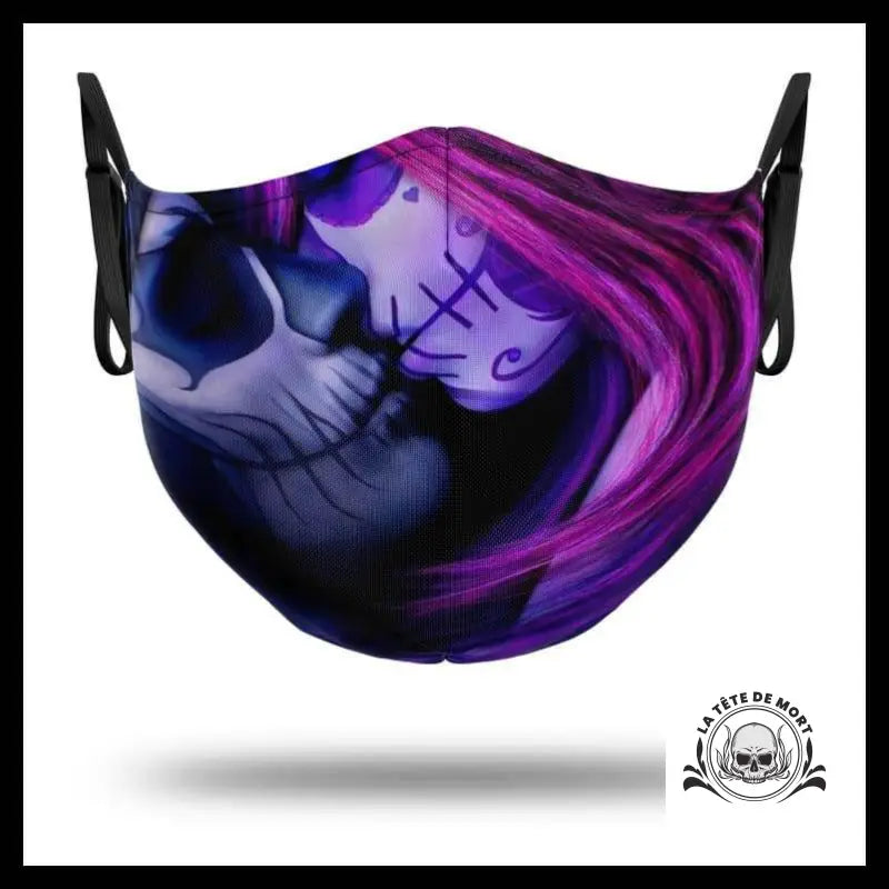 Le masque crâne stylé présente une scène éclatante et colorée qui se manifeste lorsque deux Mexicaines s'embrassent.