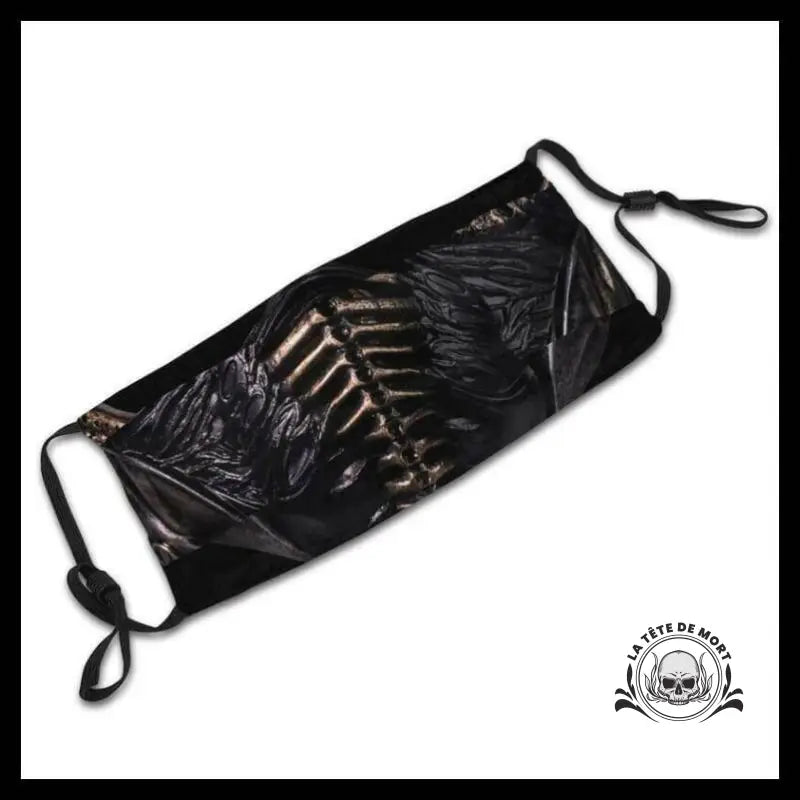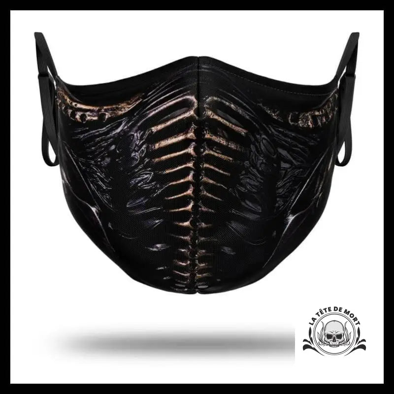 Découvrez la transformation ultime avec ce masque à la fois magnifique et effrayant. Le fond noir met en valeur le squelette en 3D doré d'une créature effrayante.