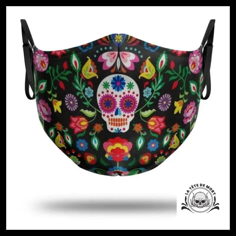 Ajoute une touche de couleur à ton style sombre en adoptant ce masque tête de mort mexicaine réaliste. Tu sublimeras ta personnalité gothique avec élégance.