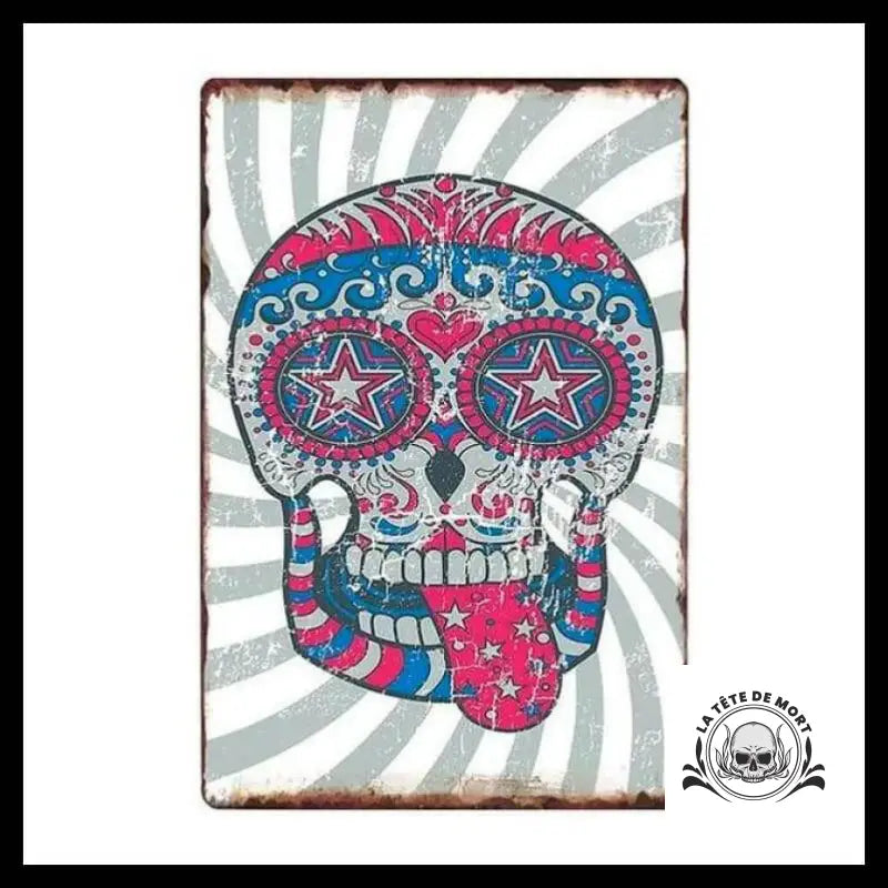 Plongez dans l'hypnose avec ce magnifique poster mexicain représentant un crâne déjanté aux designs psychédéliques colorés. Cependant, soyez averti que ce dessin est incroyablement dangereux et diabolique !