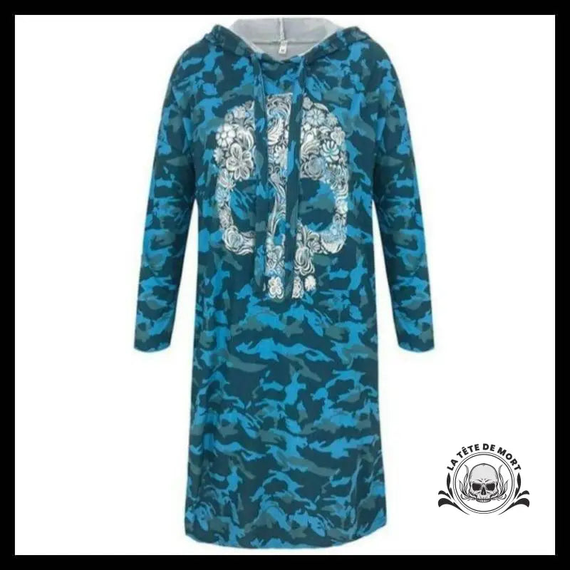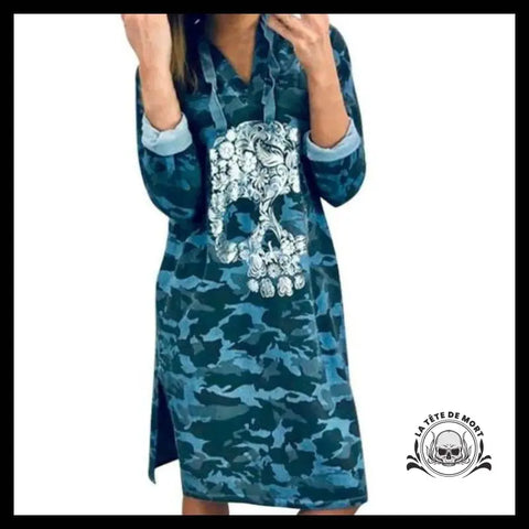 Découvrez cette robe au design marin camouflage sombre avec une touche de mystère et de féminité. Le motif de crâne dessiné avec des fleurs délicates lui donne un look à la fois confortable et mortellement séduisant.