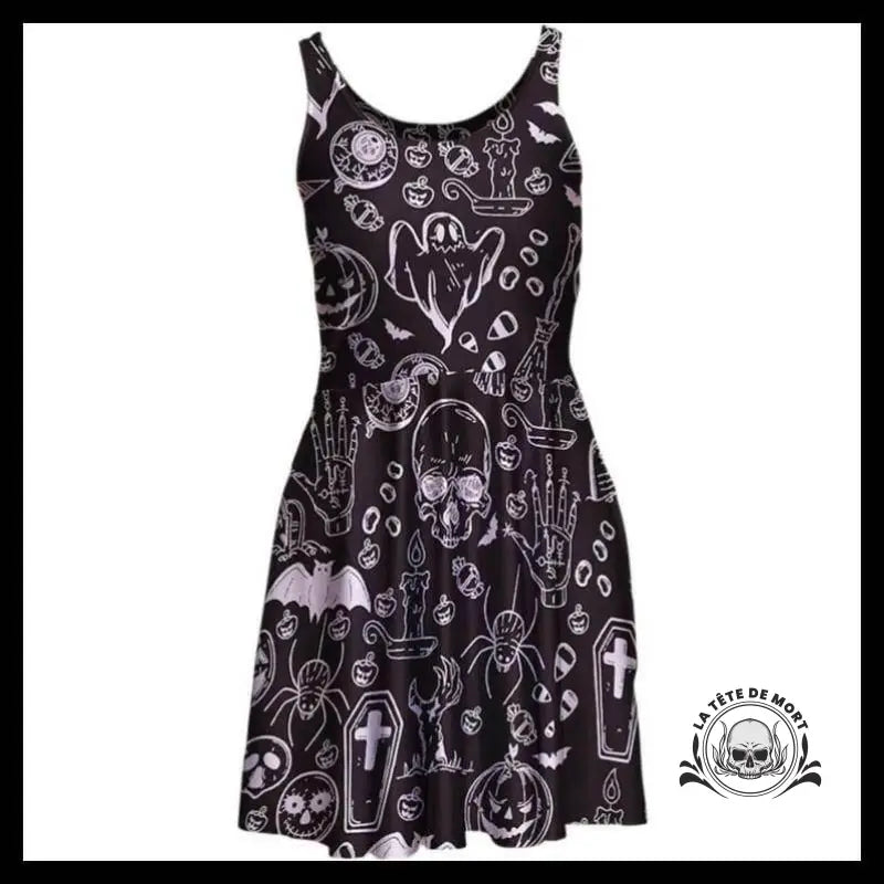 La robe noire légère à motif de tête de mort est ornée de petits dessins crayonnés en noir et blanc, comprenant des fantômes, des crânes humains et des pierres tombales. Cette robe est idéale pour adopter un look décontracté et amusant, tout en ayant une touche de morbidité avant de sortir en soirée.