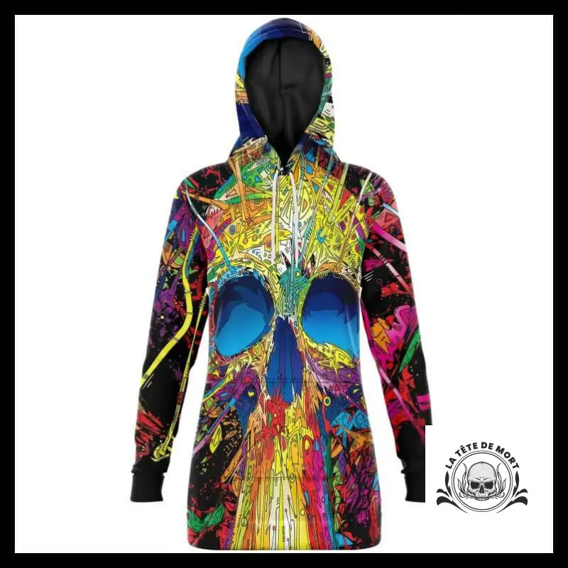 Si tu cherches une robe à la fois originale et confortable, cette pièce multicolore en tissu épais avec une tête de mort psychédélique pourrait te plaire. En plus, la capuche amovible te permet de changer de look en un rien de temps, en ajoutant une touche ténébreuse à ta tenue. Avec ses couleurs vibrantes et son design unique, cette robe ne passera pas inaperçue.