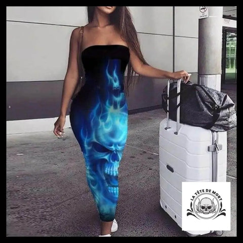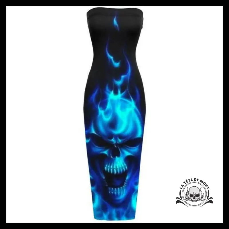 Ajoutez une touche de mystère à votre tenue avec cette robe à tête de mort bleue surmontée de flammes bleues. Cliquez pour finaliser votre style effrayant et étonnant !