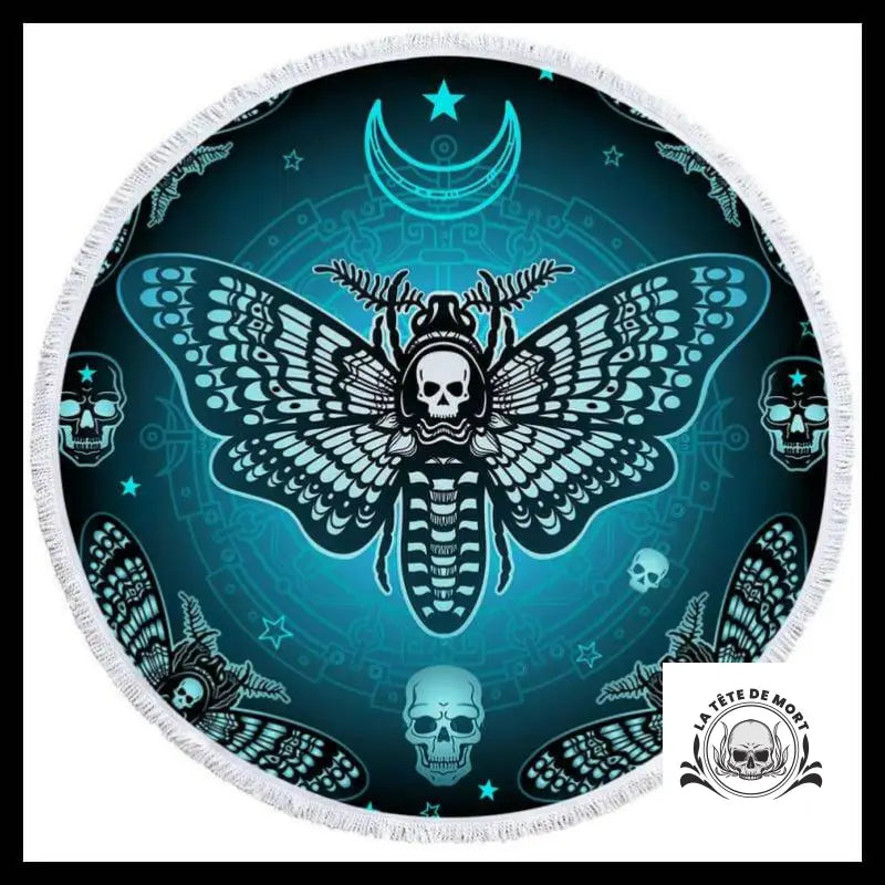 Cette serviette de plage arbore un motif de tête de mort papillon dans des nuances de bleu, accompagné d'un papillon qui rappelle un insecte tueur. Le bord de la serviette est décoré de plusieurs têtes de mort qui apportent une touche sombre même sous le soleil. Profitez d'un accessoire unique pour vous détendre à la plage ou à la piscine avec style.