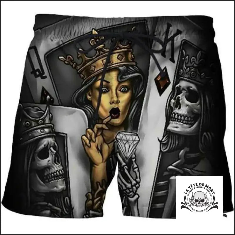 Il semblerait que certains souverains cherchent à corrompre votre reine, comme le suggère ce short orné d'une tête de mort de poker. Il est essentiel de se battre pour la protéger, même en utilisant la force physique si cela s'avère nécessaire.