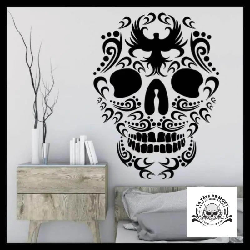 La pièce maîtresse de cette décoration d'intérieur est un autocollant représentant un crâne mexicain en noir et blanc, orné d'un oiseau puissant en son centre, qui semble dominer l'ensemble de l'espace. Cette pièce ajoute une touche d'audace et de caractère à toute pièce où elle est installée.