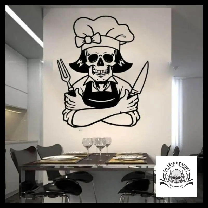 Ce sticker décoratif d'intérieur met en scène un chef cuisinier talentueux et sympathique. Avec son air déterminé, il semble prêt à préparer de délicieux repas pour vous et vos amis, même si ces derniers sont des zombies ! Cette décoration murale ajoutera une touche ludique et originale à votre cuisine ou salle à manger.