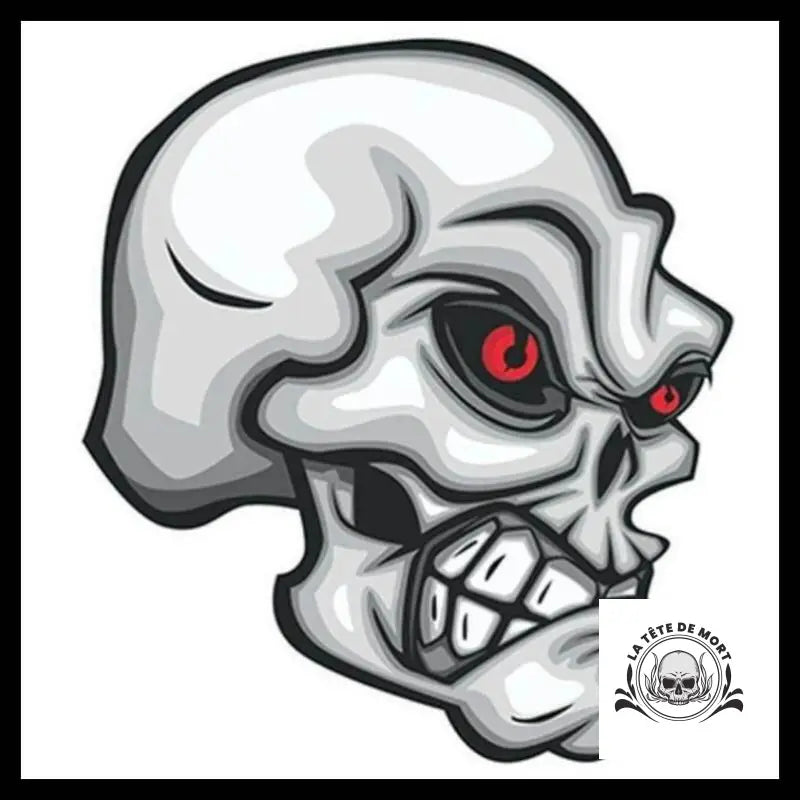 Ce sticker présente une tête de mort impressionnante, avec des yeux rouges perçants et une apparence de dur à cuire. On ne peut s'empêcher de se demander ce qui a pu provoquer une telle colère chez ce personnage sinistre.