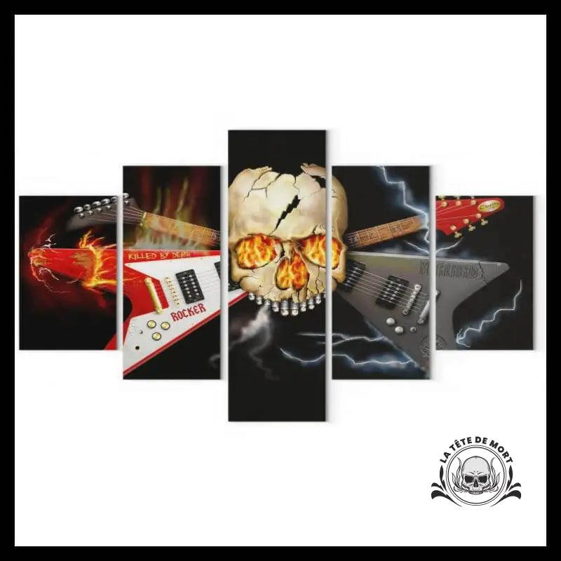"Notre passion se concentre sur le Hard Rock. Nous nous réunissons chaque soir dans une grotte pour répéter sur des équipements sonores peu fiables. Nous ne nous laissons pas décourager par cela et continuons à donner le meilleur de nous-mêmes. Embellis ton espace avec ce tableau de rock and roll ! "