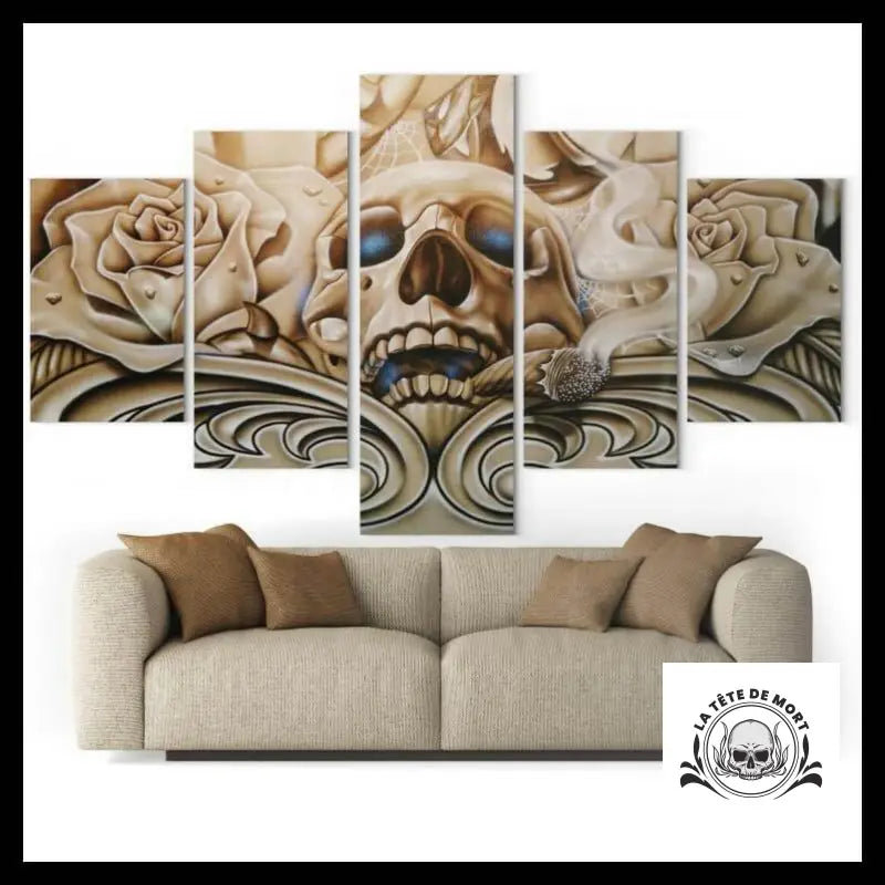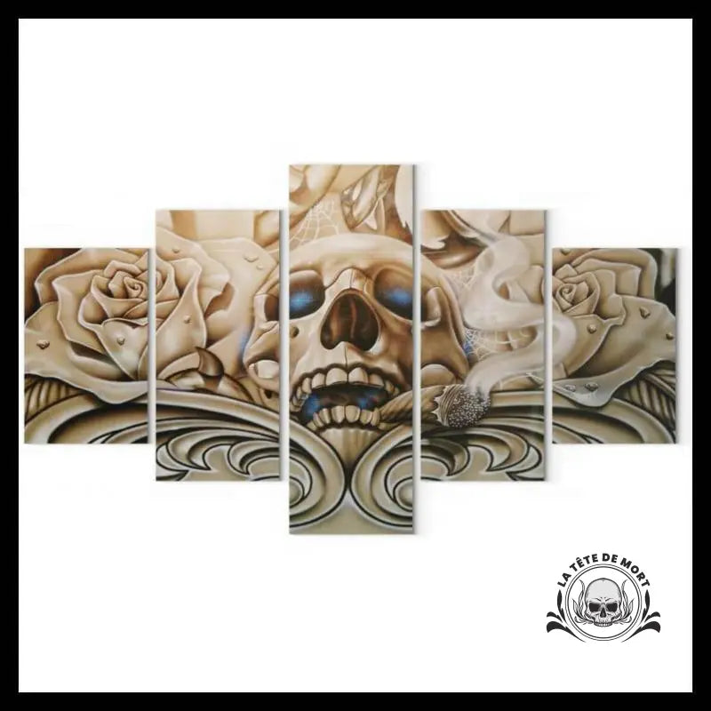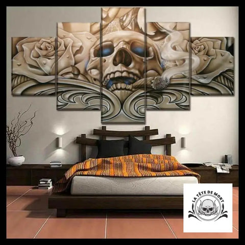 Ajoute une touche terrifiante à ta pièce en accrochant ce tableau représentant un squelette fumant. La citation "En Sicile, les femmes sont plus redoutables que les coups de feu" apporte une touche d'exotisme à l'oeuvre.