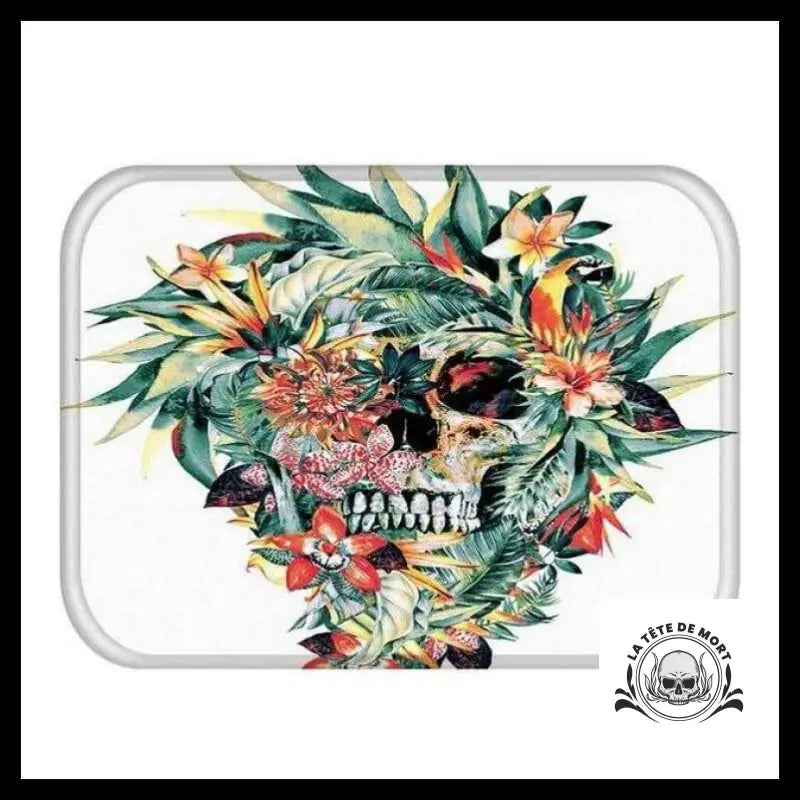 Cette tête de mort a donné naissance à la vie, prouvant que la vie est toujours plus forte. Ce tapis délicat, représentant un crâne et des fleurs macabres, est un mélange vibrant de couleurs avec des fleurs et des plumes en mouvement.