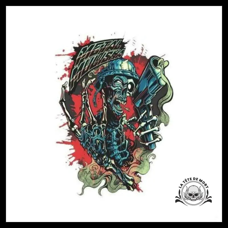Fais régner l'ordre et la crainte grâce à ce transfert époustouflant représentant un sinistre squelette armé d'un pistolet fumant, animé par des forces maléfiques.