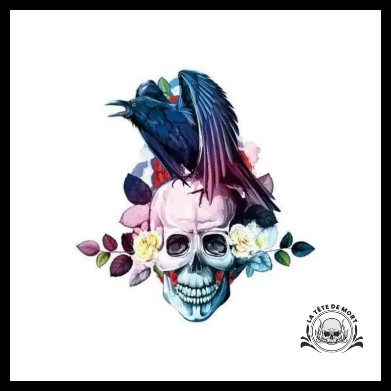 Le corbeau est souvent associé à des présages funestes. Dans cette représentation sombre où une tête de mort est mise en avant, l'oiseau noir se pose sur un crâne qui, malgré tout, laisse place à la vie qui reprend ses droits : la vie triomphe toujours.