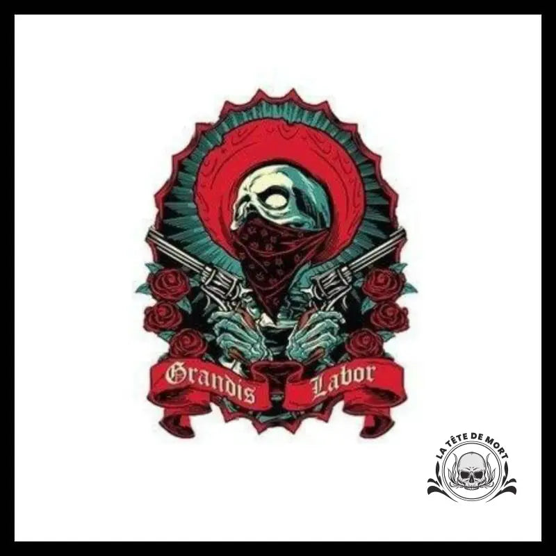 Obtenez un look de gangster authentique avec cet impressionnant transfert de tête de mort ultra-stylé ! Avec les pistolets en avant et un regard sombre, vous êtes prêt à faire des ravages. C'est à vous de jouer !